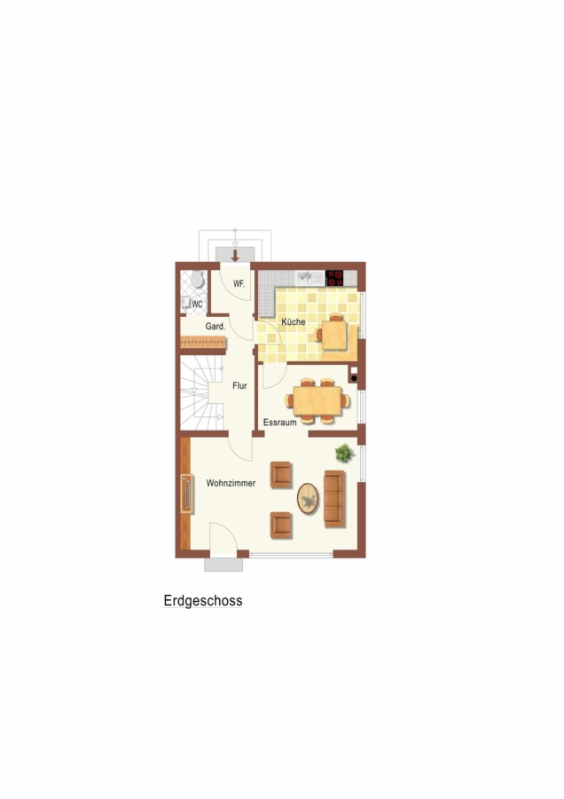 Über den Eingangsbereich mit großzügiger Garderobe und Gäste-WC gelangen Sie in den offenen Wohn- und Essbereich, der durch große Fensterflächen und den offen gestalteten Grundriss eine freundliche und einladende Wohnatmosphäre schafft. Angrenzend befindet sich die Küche mit praktischer Speisekammer. Eine Einbauküche ist derzeit nicht vorhanden, sodass Sie hier die Möglichkeit haben, Ihre Küche ganz nach Ihren eigenen Vorstellungen zu realisieren.