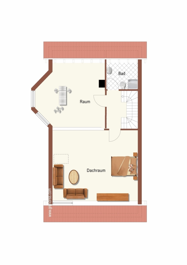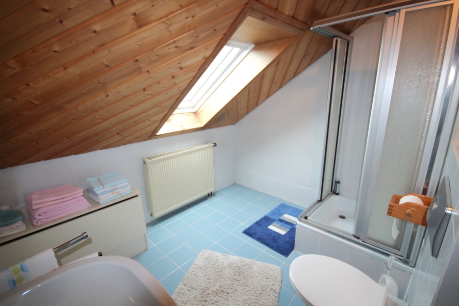 Durch ein paar weitere Stufen gelangen Sie in das ausgebaute Dachgeschoss. Hier befindet sich ein weiteres Badezimmer inkl. Dachfenster und Dusche. Sowie das äußert großzügige, lichtdurchflutete Dachstudio.