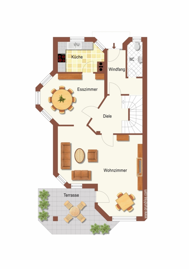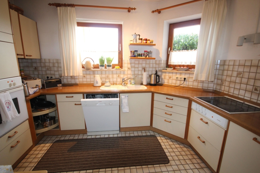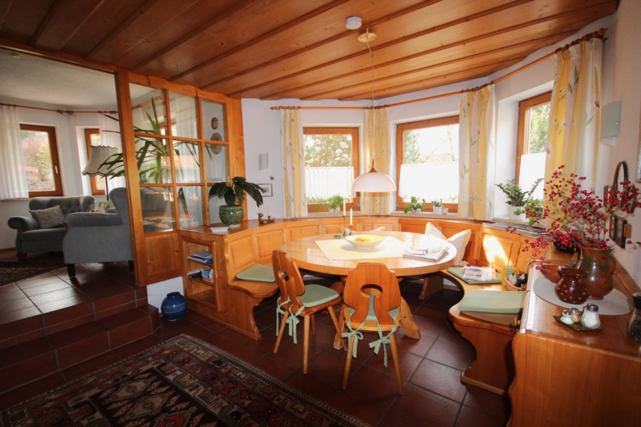 Im Erdgeschoss erwartet Sie ein offener Wohn- und Essbereich. Ein Kachelofen sorgt in den Wintermonaten für behagliche Wärme. Die zahlreichen Fenster lassen viel Tageslicht in das Objekt und schaffen eine freundliche, helle Atmosphäre. Von hier aus gelangen Sie direkt auf die Terrasse mit angrenzendem Garten – ein idealer Ort zum Wohlfühlen. Rechts neben dem Essbereich befindet sich die separate Küche, die durch eine Schiebetür abgetrennt ist.