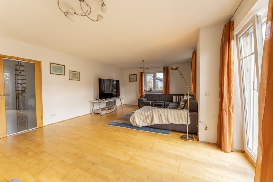 Im Wohnzimmer sowie in dem Flur OG ist Massivholzparkett verlegt