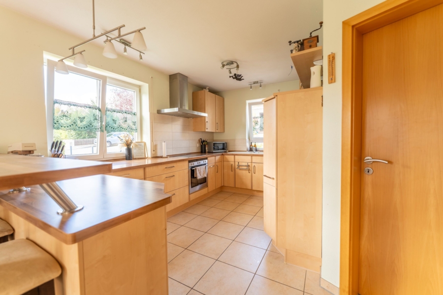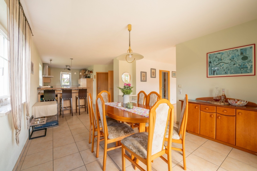 Schon beim Betreten des Hauses spürt man die einladende Atmosphäre. Über den hellen Eingangsbereich gelangt man in das lichtdurchflutete Wohnzimmer. Von dort aus öffnet sich der Blick in die geräumige Küche und großzügigem Essbereich, welche an eine praktischen Speisekammer angeschlossen ist. Dieser fließende Übergang schafft eine harmonische Verbindung zwischen den Wohnbereichen und lädt zu geselligen Stunden mit Familie und Freunden ein. Zwischen Ess- und Wohnbereich besteht zudem die Möglichkeit, einen Kaminofen anzuschließen. Der Wohn- und Essbereich bietet jeweils einen direkten Zugang zur sonnigen großen Terrasse, die sich ideal für entspannte Stunden im Freien eignet. Im Erdgeschoss befinden sich außerdem ein helles Gästezimmer, sowie ein modernes Duschbad mit WC.